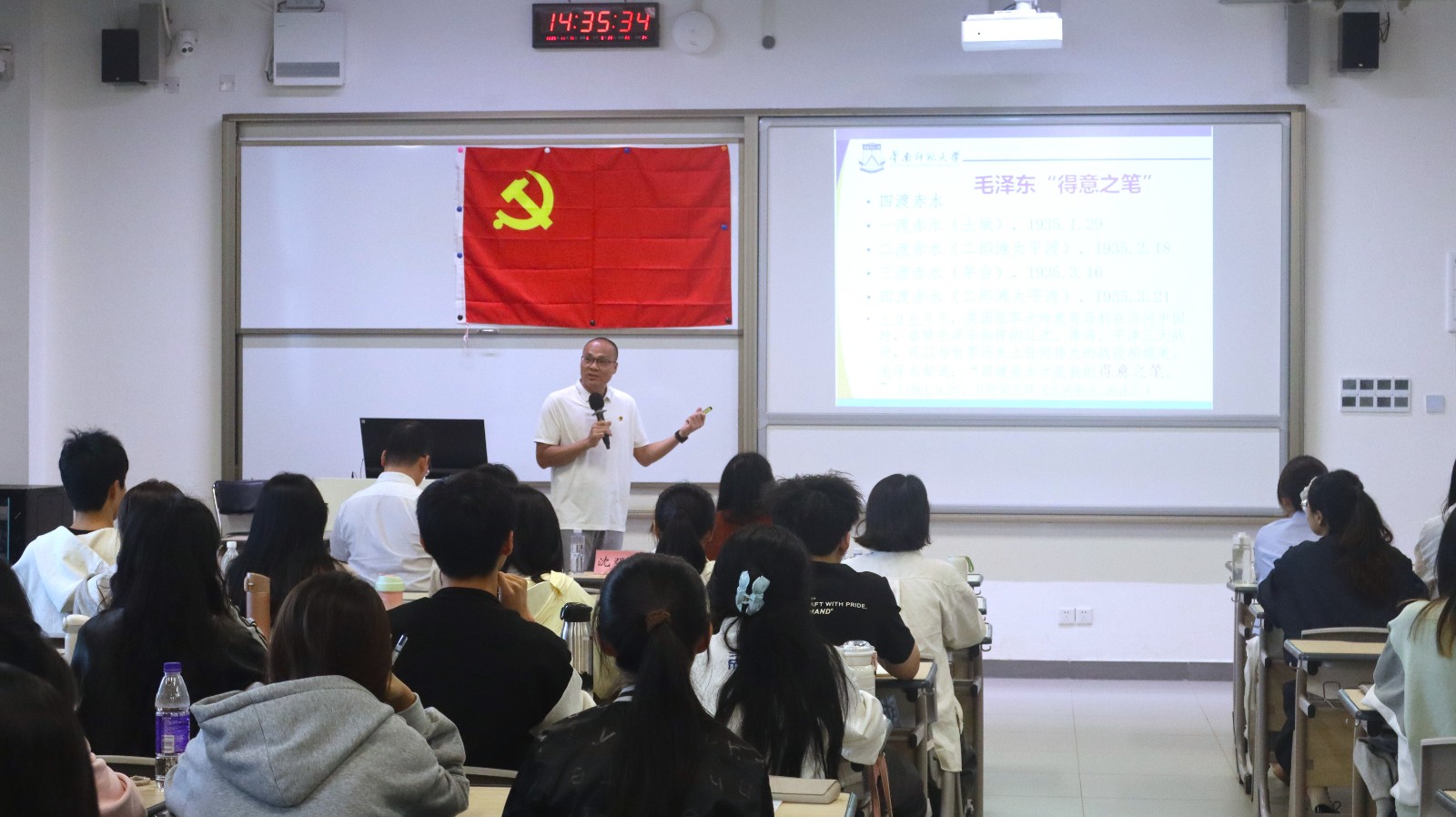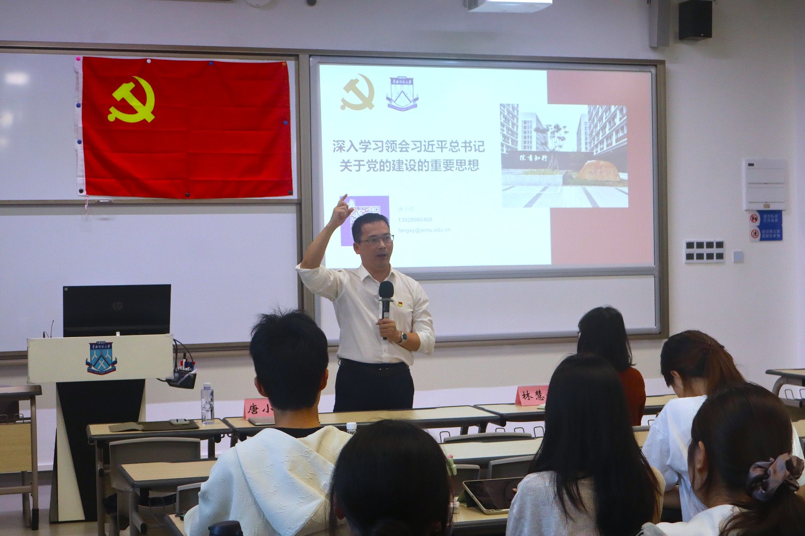 理论课程环节,网络信息中心直属党支部书记彭伟忠以《党的性质、宗旨和指导思想》为题,结合历史与现实案例,深入浅出地阐述了党为人民谋幸福、为民族谋复兴的初心使命,引导学员坚定理想信念、增强党性意识。华南先进光电子研究院党委书记沈强旺从毛泽东诗词角度切入,讲授《毛泽东的“得意之笔”——关键节点看党的作风建设》专题党课,以遵义会议等党史关键转折节点为脉络,深入阐释了党的重要决策背后的战略考量与深远意义;唐小煜以《深入学习领会习近平总书记关于党的建设的重要思想》为题,从大党独有难题、回应时代课题等方面,解读坚持党的建设的重要性,强调这一重要思想为新时代新征程党的建设提供了根本遵循,必须切实转化为推动工作的强大动力。