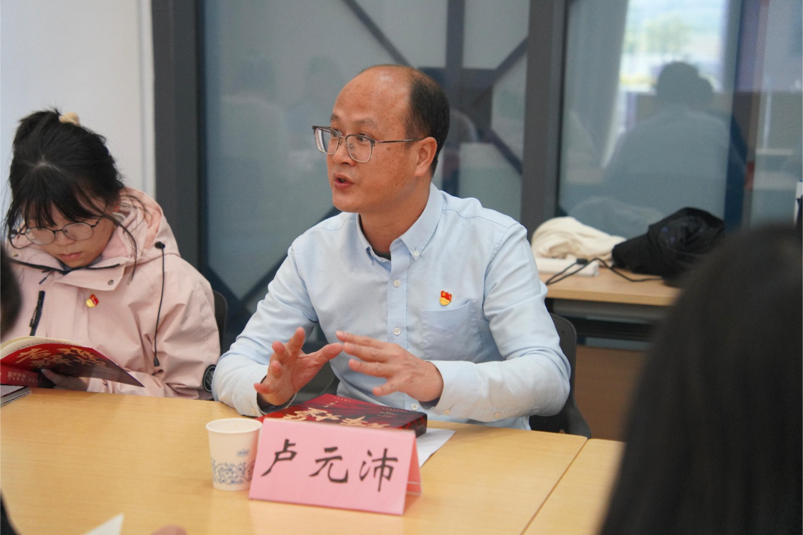 导读环节中,卢元沛围绕“近代中国的历史主线是什么”“中华民族为何能生生不息、有何种精神力量支撑”等四个核心问题,通过梳理目录、简述章节内容系统提炼书籍核心观点与历史逻辑,引导师生深入思考。随后,师生诵读书籍经典文段,并结合阅读书籍的思考与感悟展开交流。大家或聚焦革命历史谈初心信仰,或结合自身经历谈使命担当,或联系书籍内容谈历史逻辑,在红色书香中进一步坚定理想信念。