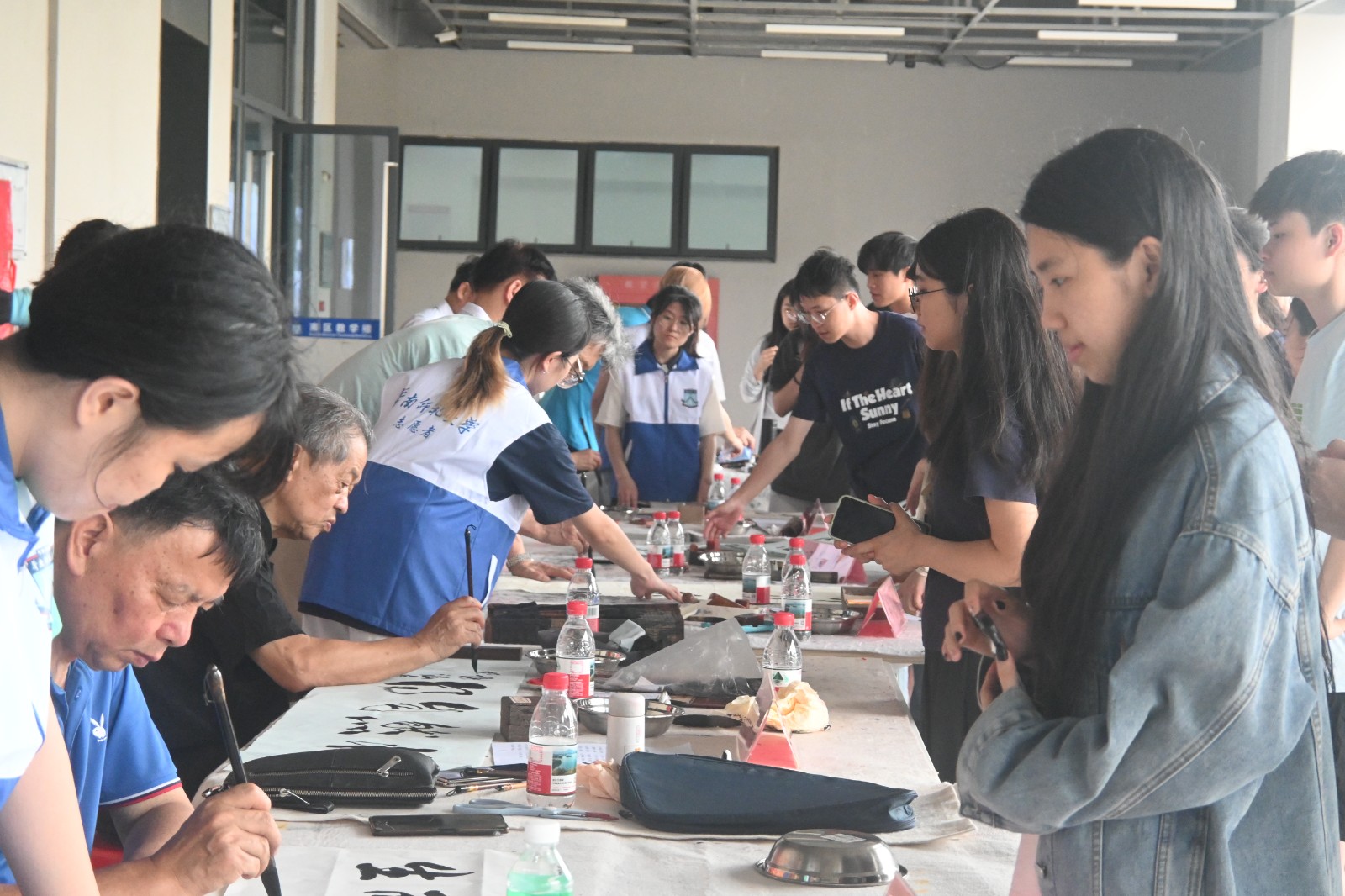 简短的开幕式后,活动进入核心环节。来自退(离)休教工书画研究院的郑维铭、邝章标等六位退休书法教授现场挥毫泼墨。案台前迅速排起了长龙,不仅有应届毕业生,也吸引了许多非毕业年级的同学。同学们精心挑选饱含寓意的励志词句,有序选择心仪的书法家,满怀期待地等候这份独一无二的毕业礼物。书法家们凝神聚气,笔走龙蛇,将殷切的期望与美好的祝福融入一幅幅或苍劲有力、或飘逸洒脱的作品之中。